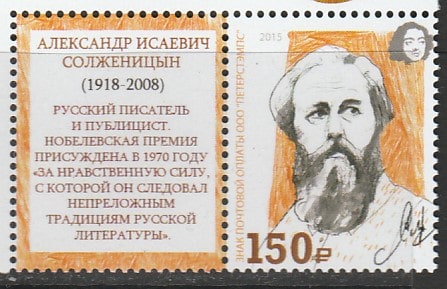 Россия "Петерспост" 2015 год. Лауреаты Нобелевской премии по литературе: А.И. Солженицын, 1 марка с купоном (непочтовая) мл