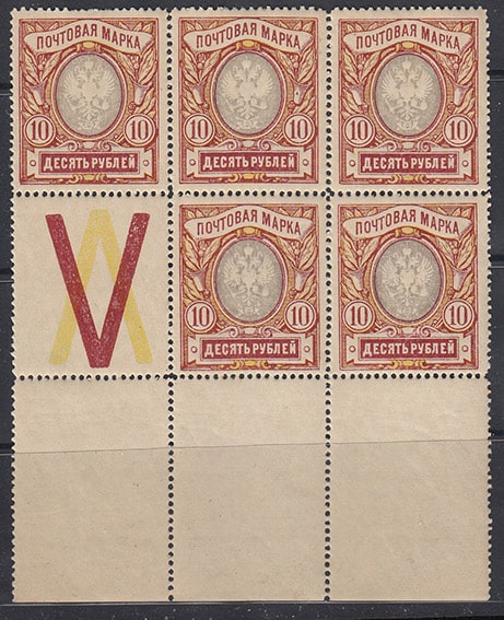 РСФСР, 1915-18 гг. 10 рублей. 5 марок с контрольным знаком и с полем