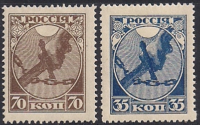 РСФСР 1918 год. Первый выпуск (первые марки, выпущенные почтой РСФСР). Рука с мечом, разрубающая цепь. 2 марки с наклейкой