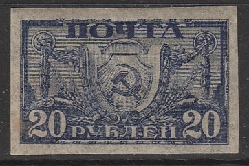 РСФСР 1921 год. Стандарт. Серп и молот на щите, ном. 20 руб., папиросная бумага, 1 б/зубц. марка.