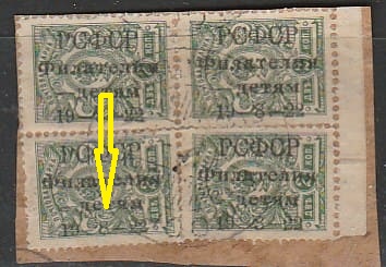 РСФСР 1922 год. "Филателия - детям 19-8-22", разновидность, спецгашение, квартблок (вырезка) (I)