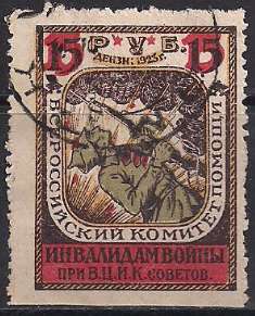 РСФСР 1923 год. Непочтовая марка комитета помощи инвалидам войны 15 рублей гашеная