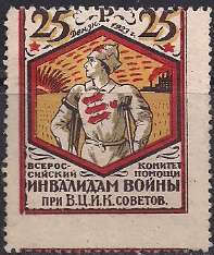 РСФСР 1923 год. Непочтовая марка комитета помощи инвалидам войны 25 рублей с наклейкой