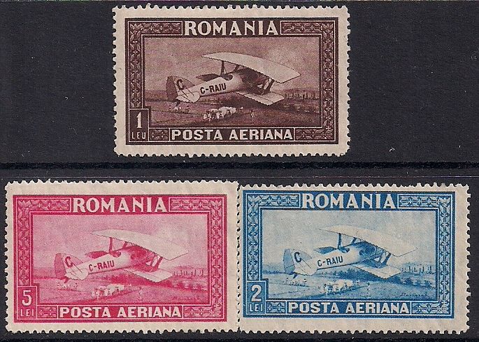 Румыния 1928 год. Авиапочта. 3 марки с наклейкой