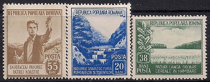Румыния 1953 год. Месячник защиты лесных угодий. 3 марки с наклейкой