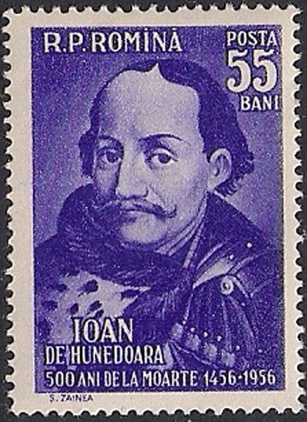 Румыния 1956 год. 500 лет со дня смерти воеводы Трансильвании Яноша Хуньяди. 1 марка с наклейкой