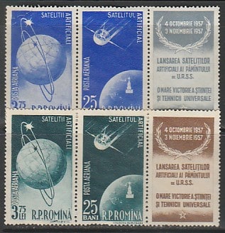 Румыния 1957 год. Запуск первых двух советских ИСЗ, 2 сцепки с правым купоном (наклейка) (15/6)