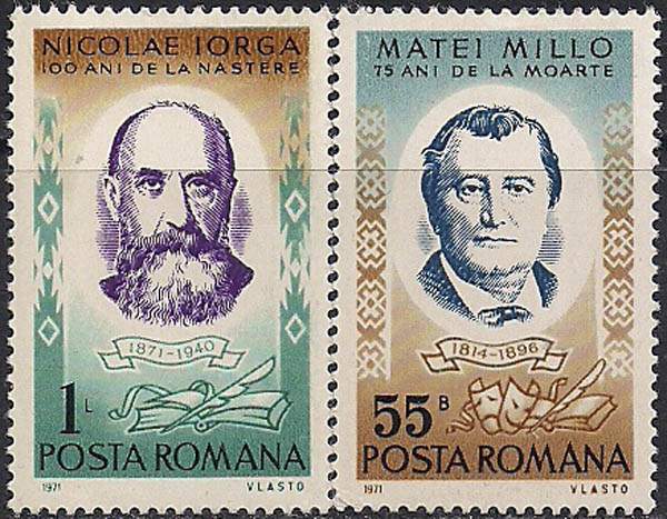 Румыния 1971 год. Персоналии - писатель М. Милло и историк Н. Лорга. 2 марки с наклейкой