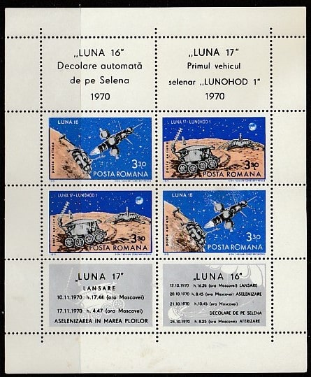 Румыния 1971 год. Советская ракета "Луна-16" и луноход "Луна-1", блок (наклейка)