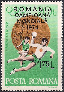 Румыния 1974 год. Победители чемпионата мира по гандболу. 1 марка с надпечаткой
