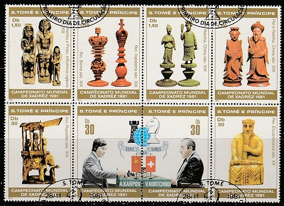 Сан-Томе и Принсипи 1981 год. Шахматы. Матч за звание чемпиона мира между А. Карповым и В. Корчным, сцепка из 8 марок (гашёные)