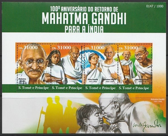 Сан-Томе и Принсипи 2015 год. 100 лет возвращению в Индию Махатма Ганди, малый лист