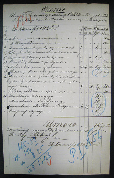 Счет на расходы 1902 года. О.И. Коровина