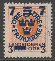 Швеция 1918 год. Герб. Стандарт для Ландштурма, надпечатка, 7+3/5/2 эре, 1 марка из серии (гашёная)