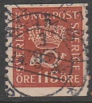 Швеция 1929 год. Стандарт. Корона и почтовый рожок, ном. 115 эре, 1 марка из серии (гашёная) С вертикальной перфорацией. (1 из 32) (20/0,3)
