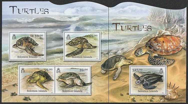 Соломоновы острова 2012 год. Черепахи, малый лист + блок (сцепка)