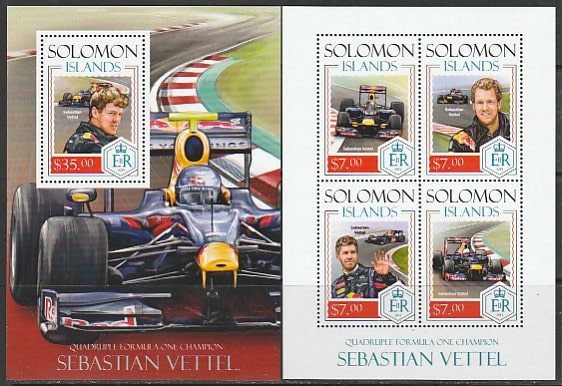 Соломоновы острова 2014 год. Немецкий автогонщик Себастьян Феттель, малый лист + блок.