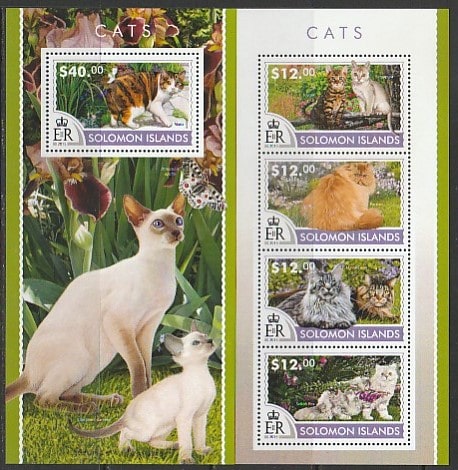 Соломоновы острова 2015 год. Домашние кошки, малый лист + блок.