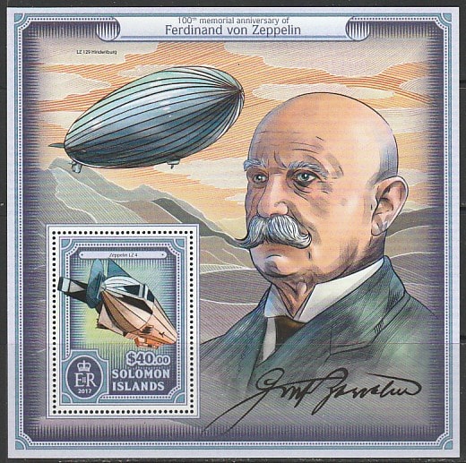 Соломоновы острова 2017 год. Фердинанд фон Цеппелин. Дирижабли, блок.