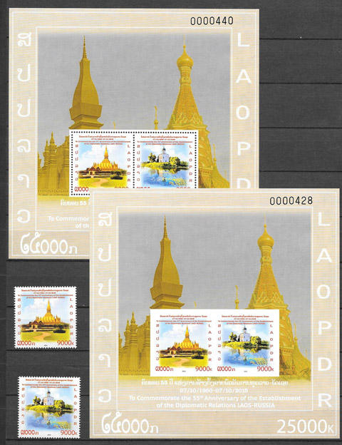 Совместный выпуск Лаос - Россия 2015 г. 55 лет дипломатических отношений Лаос - Россия, 2 блока с зубцами и без зубцов. и 2 марки.