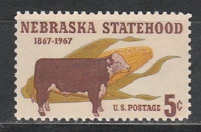 США 1967 год. 100 лет штату Небраска. Корова. 1 марка.