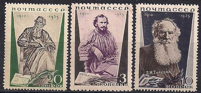 СССР 1935 год. 25 лет со дня смерти Л.Н. Толстого (429-31). 3 марки с наклейкой