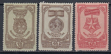 СССР 1945 год. Ордена и медаль материнства, 3 марки. с/з