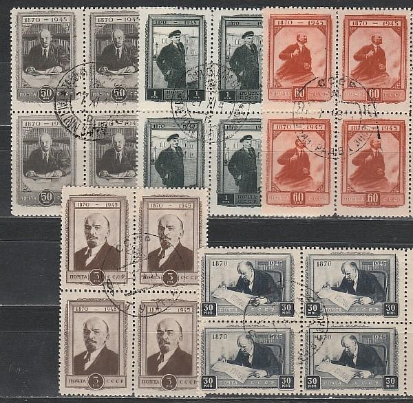 СССР 1945, В. Ленин, 5 гаш. квартблоков с клеем