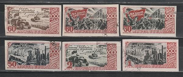 СССР 1947, 30 лет ВОСР. 6 гаш. марок без зубцов с клеем