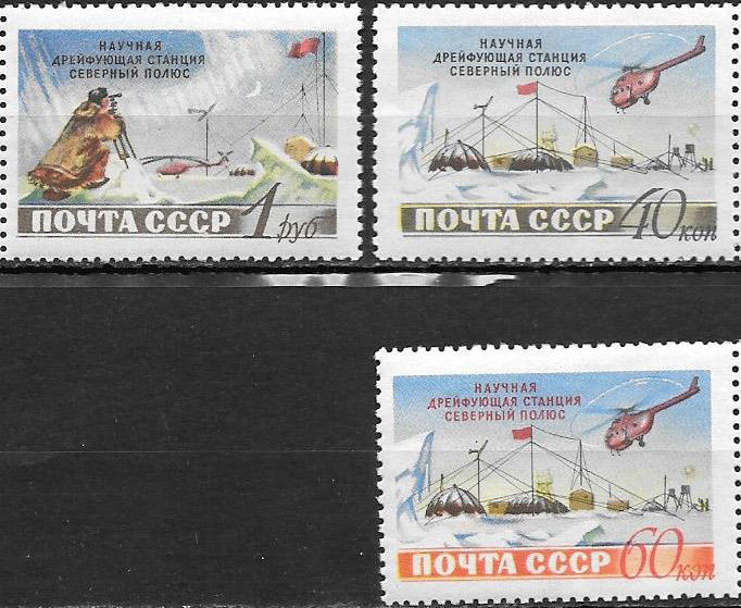 СССР 1955 год. Советская научная дрейфующая станция "Северный полюс", 3 марки Наклейки