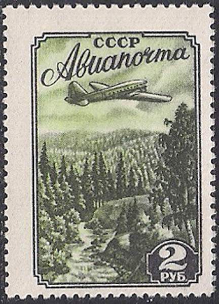 СССР 1955 год. Стандарт. Авиапочта. Самолёт над тайгой. 1 марка