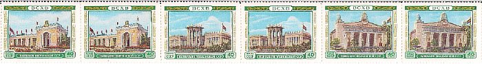 СССР 1955 год. ВСХВ. Павильоны (1733, 33, 38, 38, 40, 40). Сцепка из 6 марок