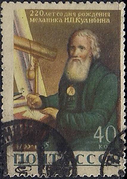 СССР 1956 год. 220 лет со дня рождения И.П. Кулибина (1794). 1 гашёная марка