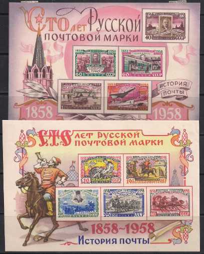 СССР 1958 год. 100 лет Русской Почтовой Марке (блок 27-28). 2 блока с наклейкой