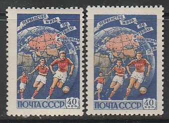 СССР 1958 год. VI первенство по футболу в Швеции, ном. 40 коп. Разновидность - разный цвет, 2 марки.