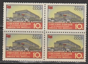 СССР 1958 год. Всемирная выставка в Брюсселе. Советский павильон, квартблок (ном.10 к.)