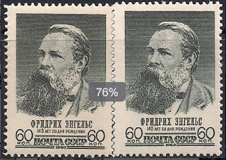 СССР 1960 год. 140 лет со дня рождения Ф. Энгельса. Разновидность - жёлтая бумага на левой марке
