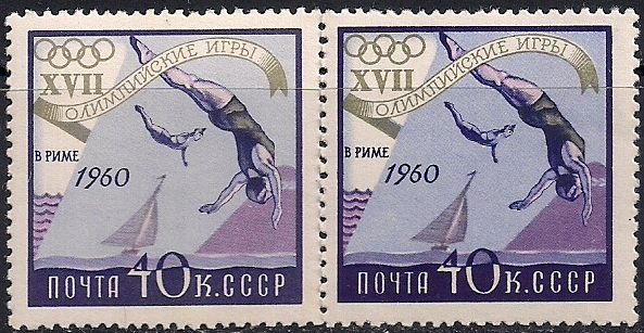 СССР 1960 год. Олимпийские Игры в Риме. Прыжки в воду (ном. 40к). Разновидность - тёмный цвет + серая бумага на правой марке