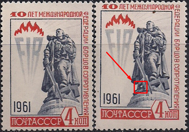 СССР 1961 год. 10 лет Международной Федерации борцов Сопротивления. Разновидность - белый просвет на пьедестале