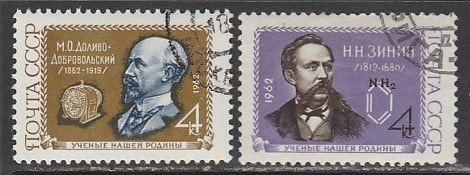 СССР 1962 год. Электротехник М.О. Доливо-Добровольский и химик Н.Н. Зинин, 2 гашёные марки