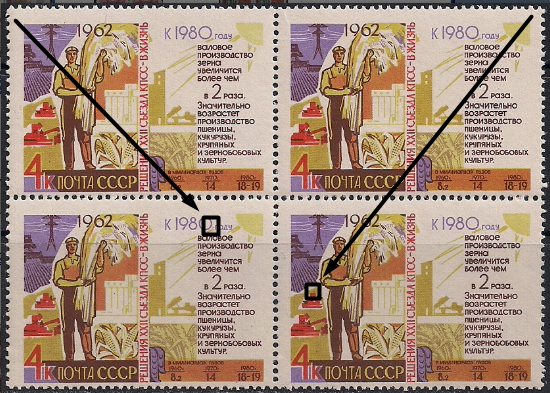 СССР 1962 год. Производство зерна (ном. 4к). Квартблок. Разновидность - точка над комбайном и в СССР 1962 год. Производство зерна (ном. 4к). Квартблок. Разновидность - точка над комбайном и в