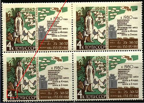 СССР 1962 год. Решения XXII съезда КПСС - в жизнь (2685). Квартблок. Разновидность - белое пятно у "4" в "4 к." (Ю)