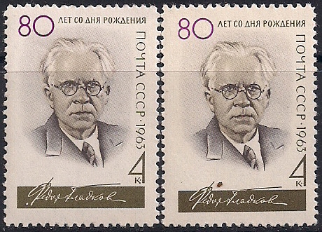 СССР 1963 год. 80 лет со дня рождения советского писателя Ф.В. Гладкова. Разновидность - разная бумага На марке справа бумага желтая