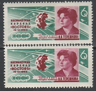 СССР 1963 год. Групповой полёт В.Ф. Быковского и В.В. Терешковой, разновидность, в нижней марке сдвиг красного цвета