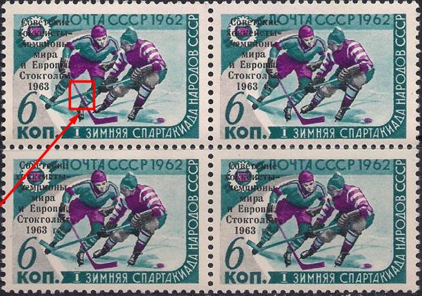 СССР 1963 год. Победа сборной СССР на первенстве мира по хоккею. Надпечатка (2739) . Квартблок. Разновидность - красная клюшка поверх зелёной (Ю)