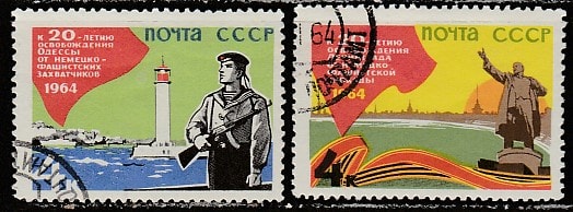 СССР 1964 год. 20 лет освобождению Ленинграда и Одессы от фашистских захватчиков, 2 гашёные марки