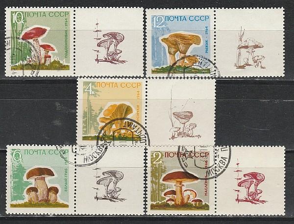 СССР 1964 год, Грибы, 5 гашёных марок с купонами (разные) справа. лак.