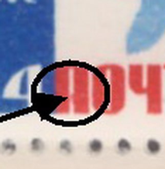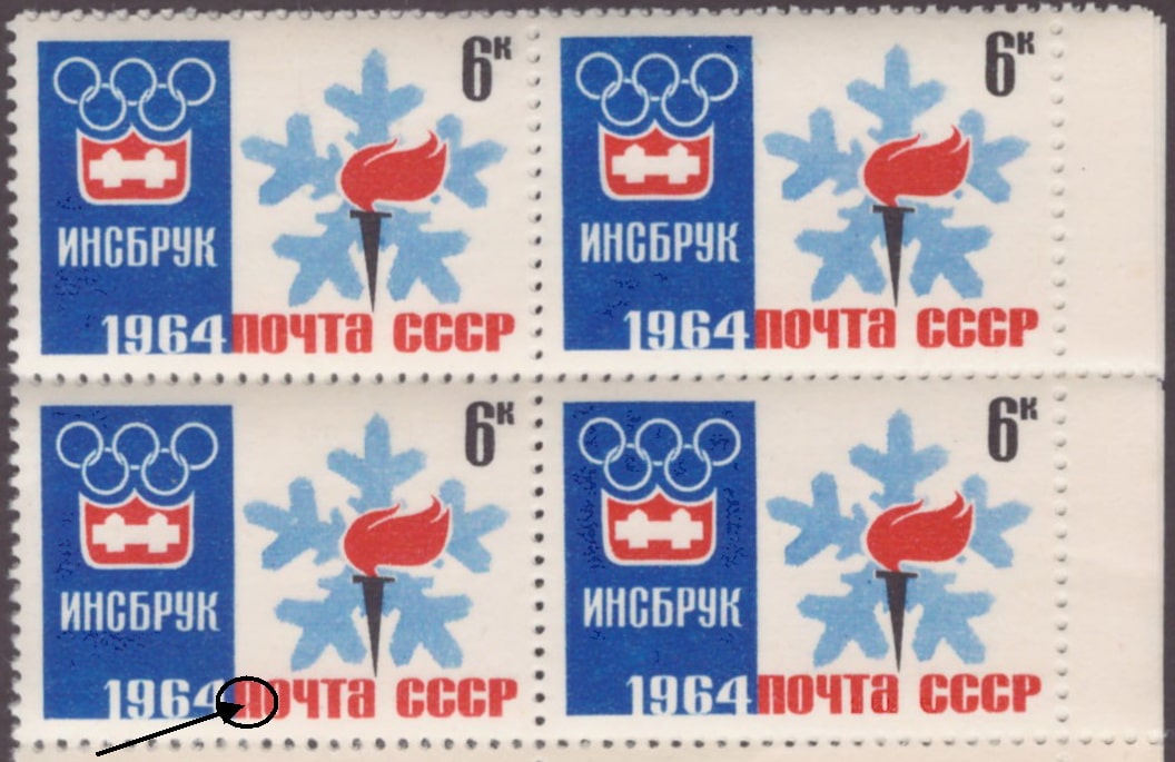 СССР 1964 год. Инсбрук. 6 к. Эмблема игр. Разновидность - внутри правой ножки "п" красное пятно