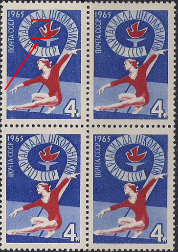 СССР 1965 год. Гимнастика (ном. 4к). Квартблок. Разновидность - "тонкая" шея у голубя