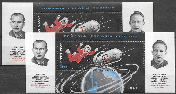СССР 1965 год. Первый в мире выход человека в космос. Разновидность - белая и серая бумага, 2 блока
